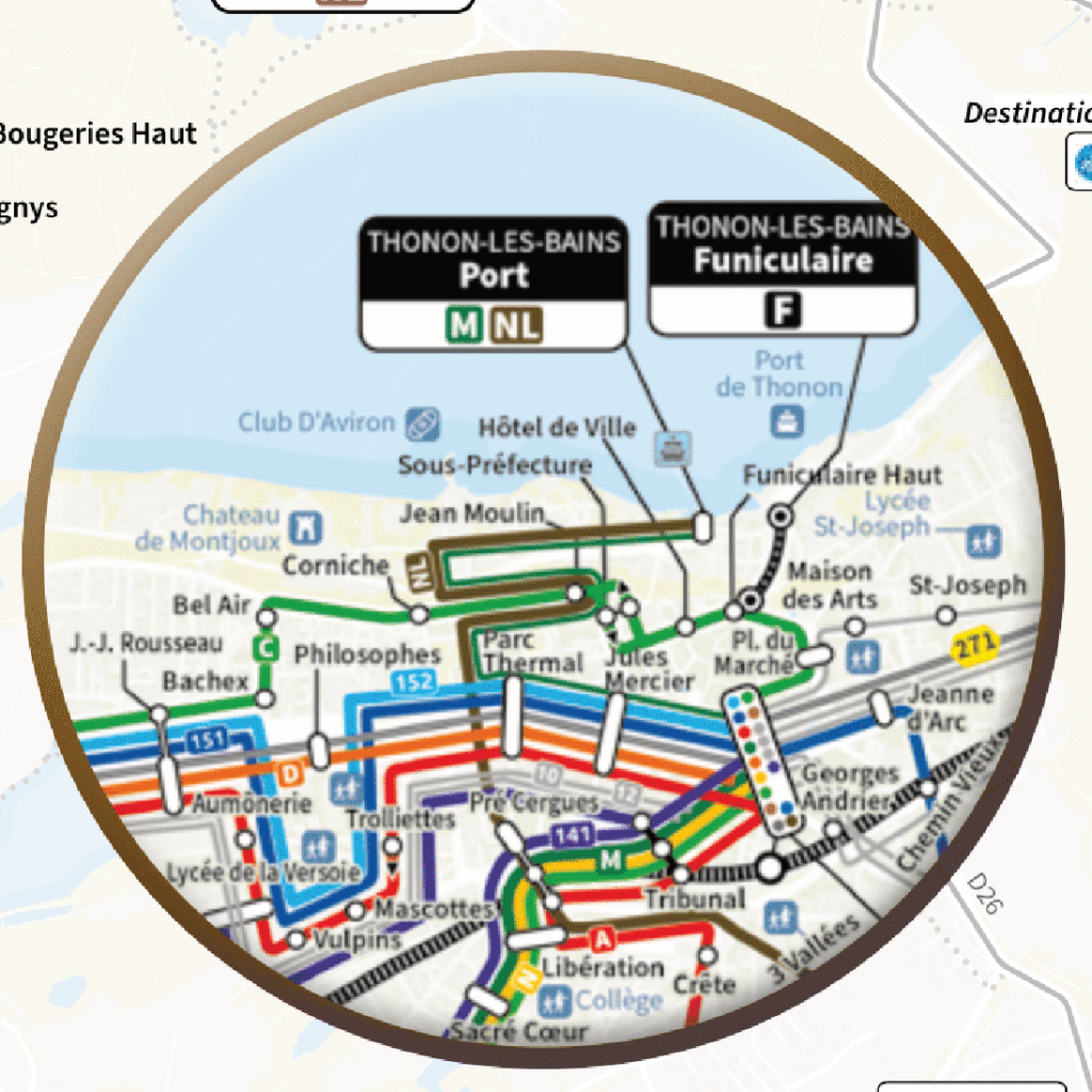 En fouillant un peu à droite du pôle d’échange, on découvre les lignes 1, 2, 10 et 12 du réseau EVA’D, perdues sous l’amoncellement d’informations. Même si elles desservent des quartiers entiers de Thonon-les-Bains, ces lignes appartiennent à la communauté de communes d’Évian. Par conséquent, le trait est fin, et la couleur presque invisible. Ce traitement de faveur est également appliqué aux Cars Région Haute Savoie (lignes Y03 et Y91).