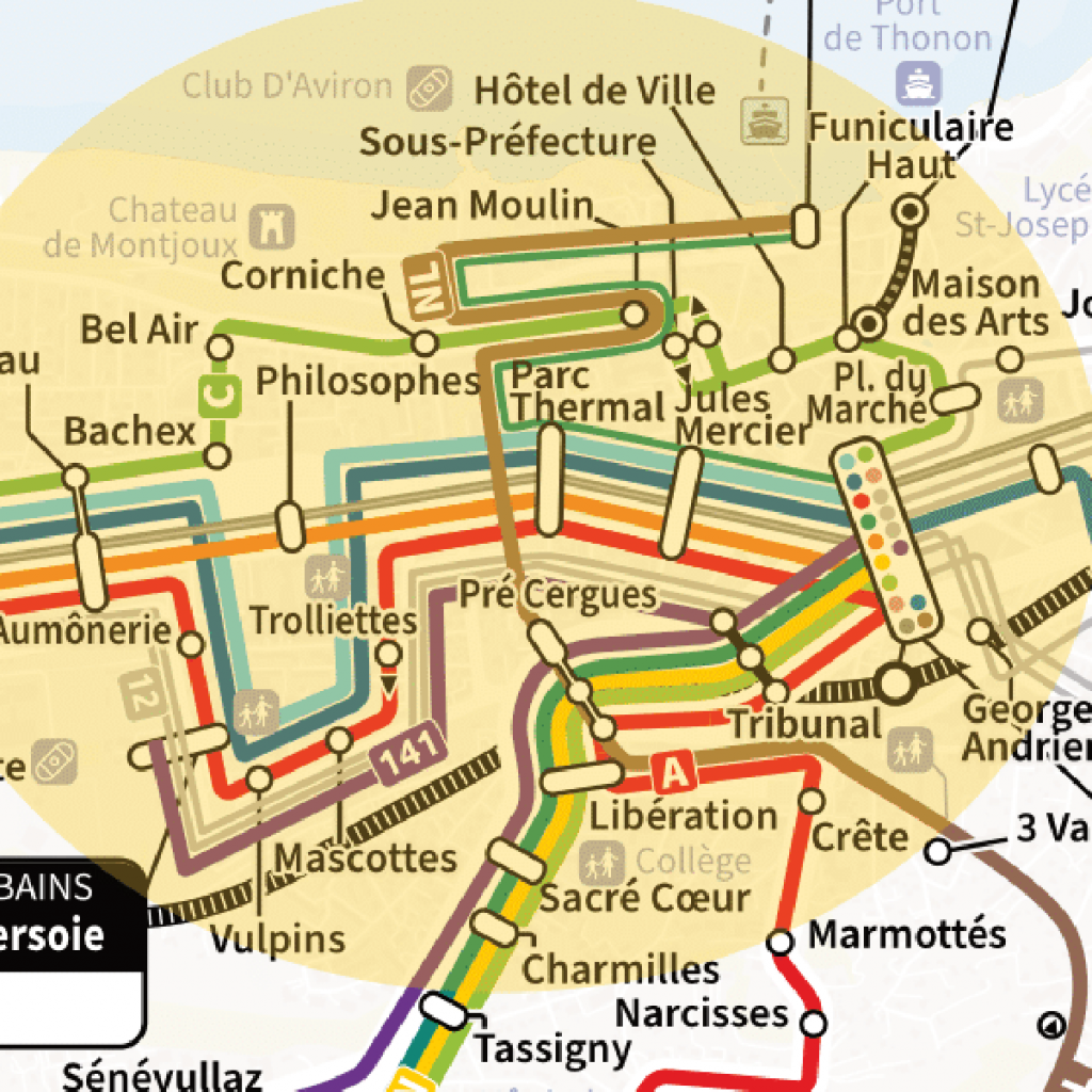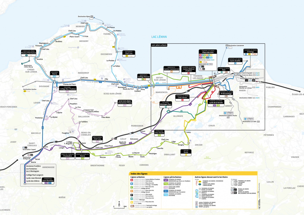 La CC de Thonon Agglo est AOM sur 25 communes et près de 240km² (en comparaison Annemasse compte moitié moins de communes, et une superficie de 72km²). Pour couvrir ce territoire, des lignes urbaines et interurbaines dans une tarification unifiées. Par conséquent on observe deux échelles, avec un plan urbain, faisant apparaître tous les arrêts des lignes urbaines, et un plan interurbain moins précis sur le centre de Thonon-les-Bains, mais qui nous emmène jusqu’au limites de l’Agglo.